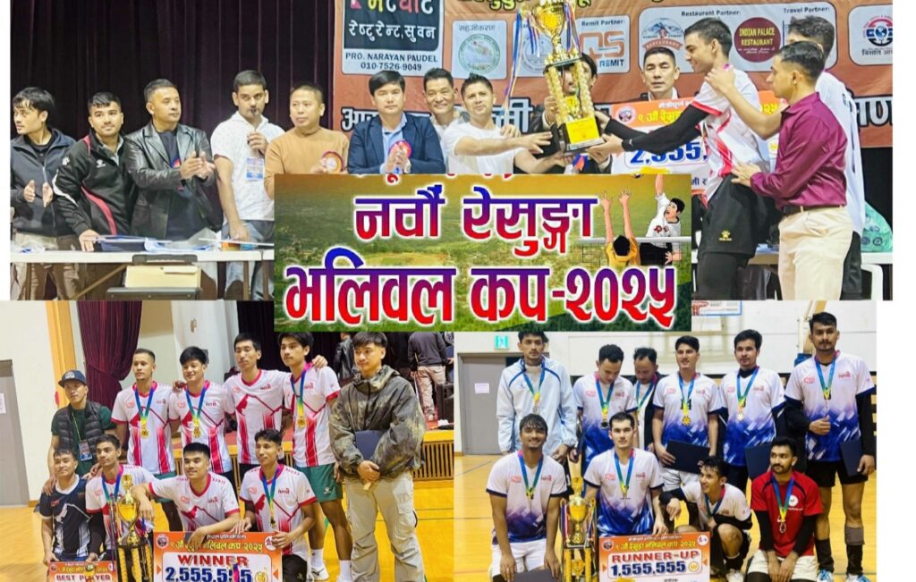 कोरिया स्थित गुल्मी सम्पर्क समितिको आयोजनामा सम्पन्न नवौं रेसुङ्गा भलिबल कप २०२५ मैत्रीपूर्ण भलिबल प्रतियोगिताको उपाधी गुल्मी सम्पर्क समितिले चुमेको छ । सुवन सहरको आजु युनिभर्सिटीको खेलमैदानमा अक्टोबर ५ सम्पन्न भएको उक्त प्रतियोगिताको फाईनलमा सुदुरपश्चिम समाजलाई फाईनलमा हराउँदै गुल्मीले नगद ...