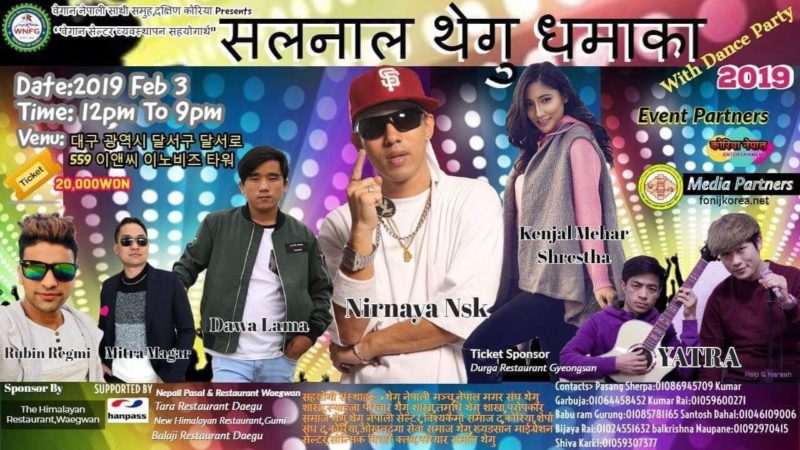 कोरियाली नयाँ बर्ष सलनालको बिदामा सलनाल थेगु धमाका तथा डान्स पार्टी हुने भएको छ । वेगान नेपाली साथी समूह दक्षिण कोरियाको आयोजनामा सलनालको अबसर पारेर २०१९ फेब्रुअरी ३ तारिख सलनाल थेगु धमाका तथा डान्स पार्टि हुने भएको हो । वेगान सेल्टर ब्यबस्थापन सहयोगार्थ कार्यक्रममा गर्न लागेको हो । धमाकामा केन्जल मेयर श्रेष्ठ, निर्णय एनएसके, दावा लामा, मित्र मगर, रुबिन रेग्मी, असिप र नरेशको बेजोड प्रस्तुति हुने छन् । धमाका तथा डान्स पार्टीमा दिनको १२ बजेदेखि बेलुकी ९ बजेसम्म रमाइलो गर्न सक्ने आयोजकले जनाएको छ ।