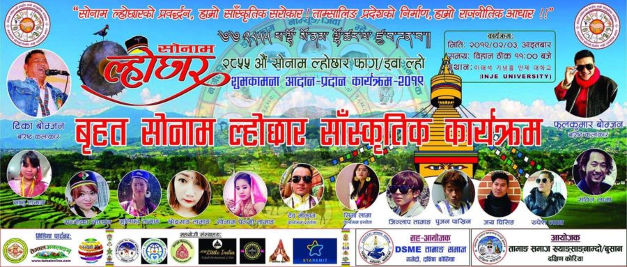तामाङ समाज ख्यङ्साङ्नाम्दो बुसान दक्षिण कोरियाको आयोजन र DSME तामाङ समाज गजेदो दक्षिण कोरियाको सहआयोजनमा नेपाली राष्ट्रिय चाड एवंम् तामाङ समुदायको महान चाड मन्जुश्री सम्बत २८५५ औं सोनाम ल्होछार(फाग, ड्वा ल्हो) को अवसरमा आयोजना गरिने संस्कृतिक ल्होछार कार्यक्रमको सम्पुर्ण तयारी पुरा भएको छ । फेब्रुअरी ३ तारीख आइतबार इन्जे युनिभर्सिटी किम्हेमा ‘’सोनाम ल्होछारको प्रर्वद्धन, हाम्रो साँस्कृतिक सरोकार। ताम्सालिङ प्रदेशको निर्माण, हाम्रो राजनीतिक आधार ’’ भन्ने मूल नाराका साथ कार्यक्रम हुनेछ ।