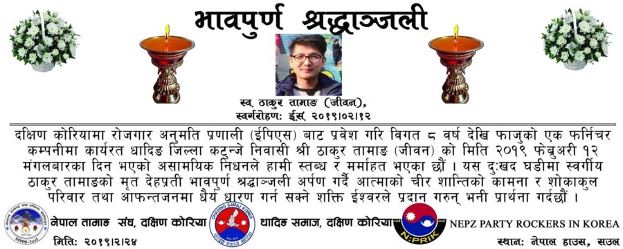 विगत ८ वर्षदेखी फाजुको फर्निचर कम्पनीमा काम गर्दै आएका जीवन भनिने ठाकुर तामाङको पार्थिब शरीर नेपाल पठाइ सकिएको तामाङ संघ दक्षिण कोरियाका अध्यक्ष मेघप्रसाद वाईबाले जानकारी गराए । ‘उहाँको परिवारको आग्रहमा पार्थिव शरीर नेपाल पढाए पनि हामीले यो आइतबार श्रद्धान्जली सभा गर्ने निर्णय गरेका छौ । यो दुखद घडिमा हामीले उहाँको आत्मलाई सम्झने हो । यसमा दक्षिण कोरियामा हरेका सबै संघसंस्थाका प्रतिनिधि र साथीभाइलाई उपस्थितीका लागि अनुरोध गर्छौ ।’ उनले भने ।
