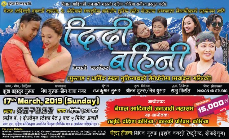 नेपाल आदिवासी जनजाती महासंघ कोरिया शाखाको आयोजना र तमुधिं, कास्की परिवार दक्षिण कोरियाको सहआयोजनामा आइतबार मार्च १७ मा नेपाली चलचित्र दिदी बहिनीकाे च्यारिटी शो गर्ने भएको हो । चलचित्रबाट संकलित रकम महासंघ कोरियाको छात्रवृत्तिमा आवासीय सुविधा सहित पोखरामा अध्ययनरत विद्यार्थीहरुलाई सहयोग गर्ने आयोजकले बताएको छ ।