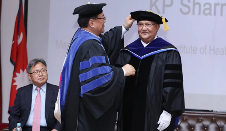 बुधबार काठकाडौंमा एक कार्यक्रमको आयोजना गरेर विश्विद्यालयलका प्रेसिडेन्ट डा.शिनिल युनले प्रधानमन्त्री ओलीलाई उपाधि प्रदान गरेका हुन् ।