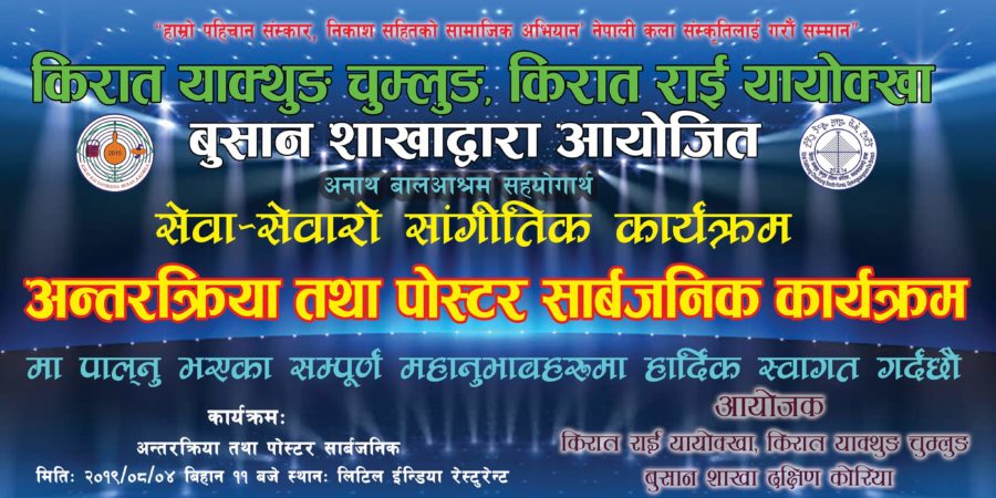 कोरिया क्यङ्साङ्नाम्दो क्षेत्रमा रहेका सम्पूर्ण नेपाली संघसंस्थाका प्रतिनिधि समाजसेवी, विद्यार्थी, पत्रकार, खेलाडी लगायत विभिन्न पेसामा आबद्ध रहेका नेपालीहरुलाई पोष्टर सार्वजनिक कार्यक्रममा उपस्थित भइदिनहुन आयोजकले अनुरोध गरेको छ।