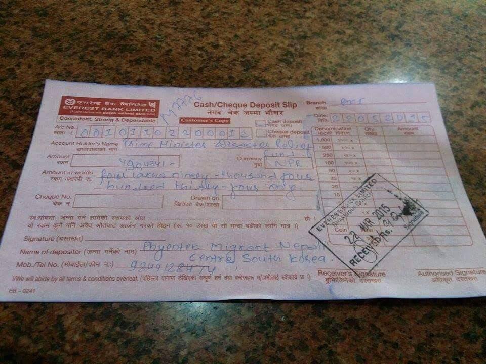 [सम्पूर्ण सहयोगीदाताहरुको नामावली र जम्मा रकम विवरण सार्बजनिक गर्दै नेपाल सरकार रास्ट्रीय दैबी प्रकोप तथा उद्धार, पुनस्थापना कोषमा डिपोजिट गरेको आर्थिक विवरण ]