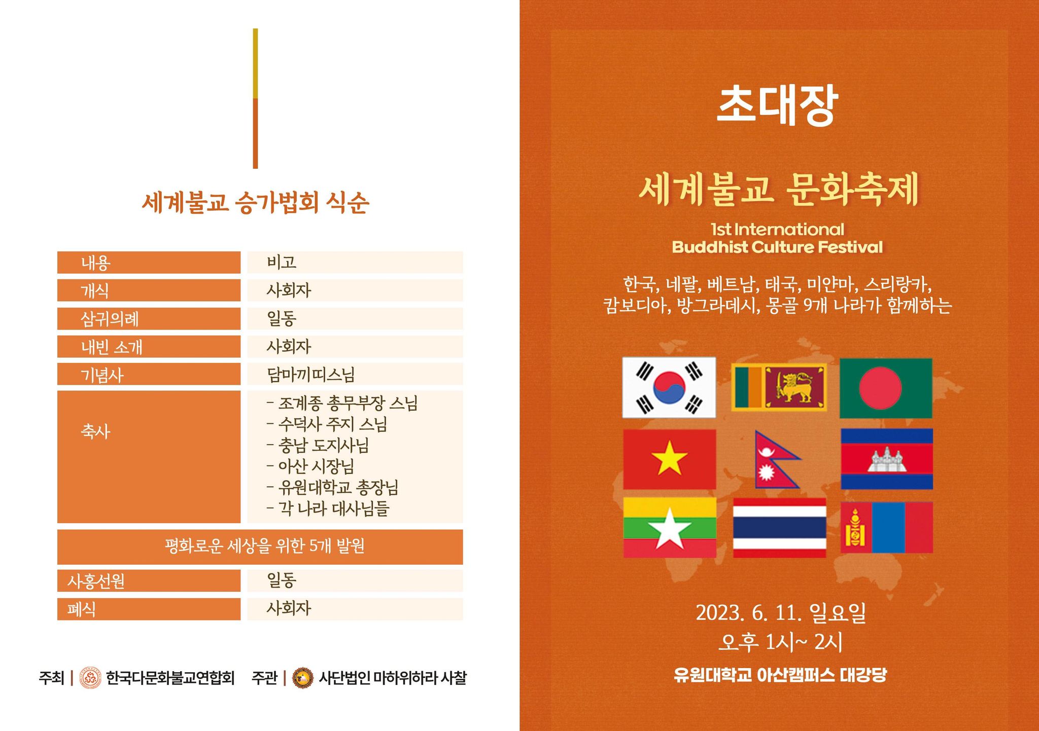कोरियाली बहुसांस्कृतिक बौद्धधर्म संघको आयोजनामा प्रथम अन्तर्राष्ट्रिय बुद्धिष्ट सांस्कृतिक महोत्सब छुङ्छननाम्दोको आसान शहरमा अवस्थित युवोन युनिभर्सिटीमा जुनको ११ तारिख आईतबार हुने भएको छ ।