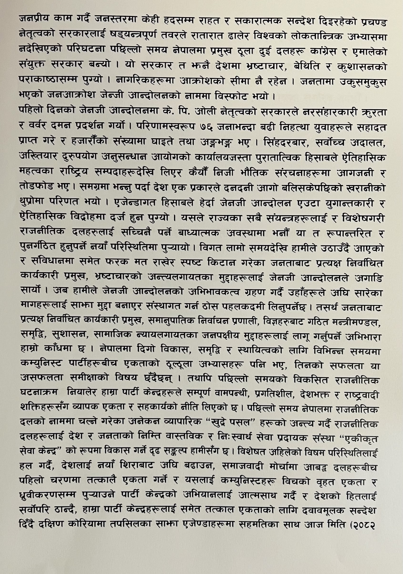 प्रमुख अतिथि एवम नेकपा माओवादी केन्द्रका एसिया प्रदेश इन्चार्ज दिपक पुनले यो एकिकरणले राम्रो सन्देश दिएको बताउँदै नेपालका राजनितिक दलहरुले अहिलेको समय बुझेर परिवर्तन हुनुपरे सुझाएका थिए। उनले ३ ठूला दलका शिर्ष नेताहरुले विभिन्न कालखण्डमा ठूलो योगदान गरेका प्रति सम्मान गर्नुपर्ने विचार व्यक्त गर्दै नयाँ अनुहार , पुस्ताको लागि मार्ग प्रशस्त गरिदिन पनि अनुरोध गरेका थिए। यसैगरी नेपाली प्रगतिशील मञ्चका अध्यक्ष एवम कार्यक्रम सभापति जीवन खतिवडाले यो आफ्नो पार्टीलाई एउटा राम्रोसन्देश दिन क्रम भंगता रहेको बताएका थिए। अन्य प्रवासका संगठनहरुलाई पनि एक हुन उनले आग्रह गर्दै नेपालमा वाम एकता हुनेमा विश्वास दिलाएका थिए। अर्का सभापति एवम प्रवासी नेपाली एकता मञ्चका कार्यवाहक अध्यक्ष (तत्कालिन) राजु राईले यो एकता हुनुपर्ने आवश्यकता थियो र यो एकिकरण देशको हितको लागि नै भएको बताएका थिए। साथै उनले कोरियामा राजदूतले आफू अनुकुल कुनै संगठनले निर्देशन गरेको कार्यक्रममा मात्र उपस्थित हुने अन्यमा उपस्थित नहुने कार्यक्रममा व्यस्त छु भनेर टार्ने गरेको आरोप लगाएका थिए।