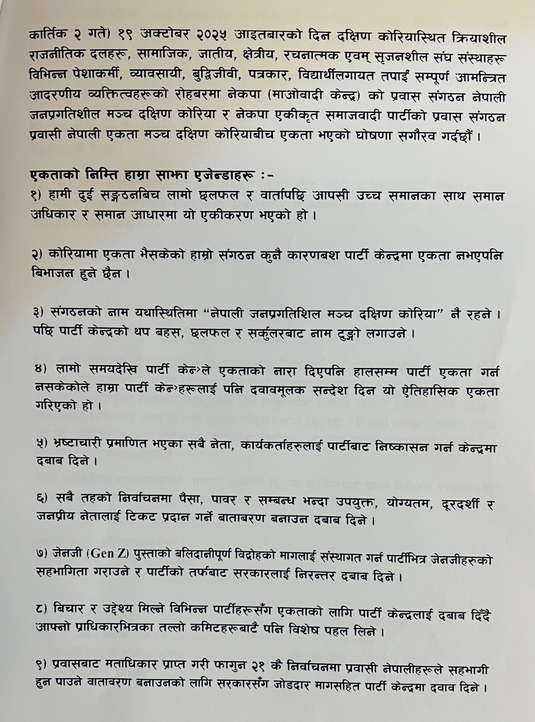 दक्षिण कोरियामा रहेका दुई राजनैतिक संगठन नेपाली जनप्रगतिशिल मञ्च र प्रवासी नेपाली एकता मञ्चबीच एकता भएको छ। अक्टोबर १९ आइतवार दोङ्देमून स्थित नेपाली थाईको सभाहलमा एकता घोषणा सभा आयोजना गरी नेकपा(माओवादी केन्द्र) को प्रवास संगठन र नेकपा एकीकृत समाजवादीका प्रवास संगठन एक भएका हुन् ।