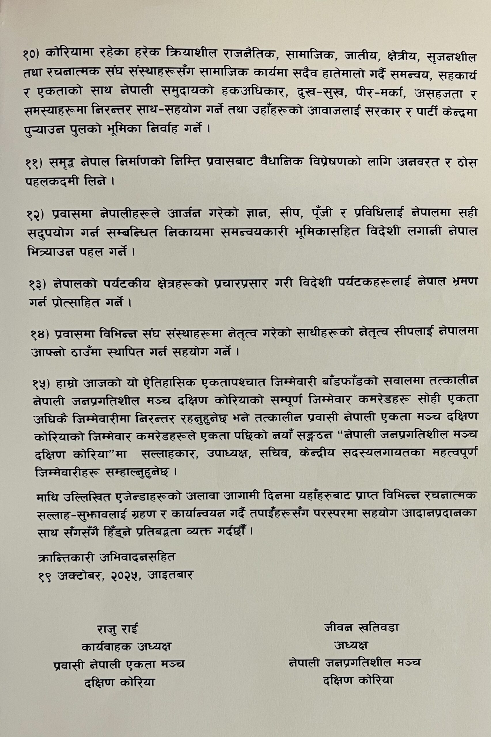 अहिलेका लागि संगठनको नाम ‘ नेपाली जनप्रगतिशिल मञ्च दक्षिण कोरिया’ नै रहने भएको छ। पछि पार्टी केन्द्रको थप बहस, छलफल र सर्कुलरबाट नाम टुङ्गो लगाउने बताइएको छ। यि दुइ संगठन लामो छलफल र वार्तापछि आपसी उच्च सम्मानका साथ समान अधिकार र समान आधारमा एकिकरण भएको जनाइएको छ। अहिले साविक कै पदमा कार्यभार सम्हाल्ने पनि कार्यक्रममा जानकारी गराइएको थियो।