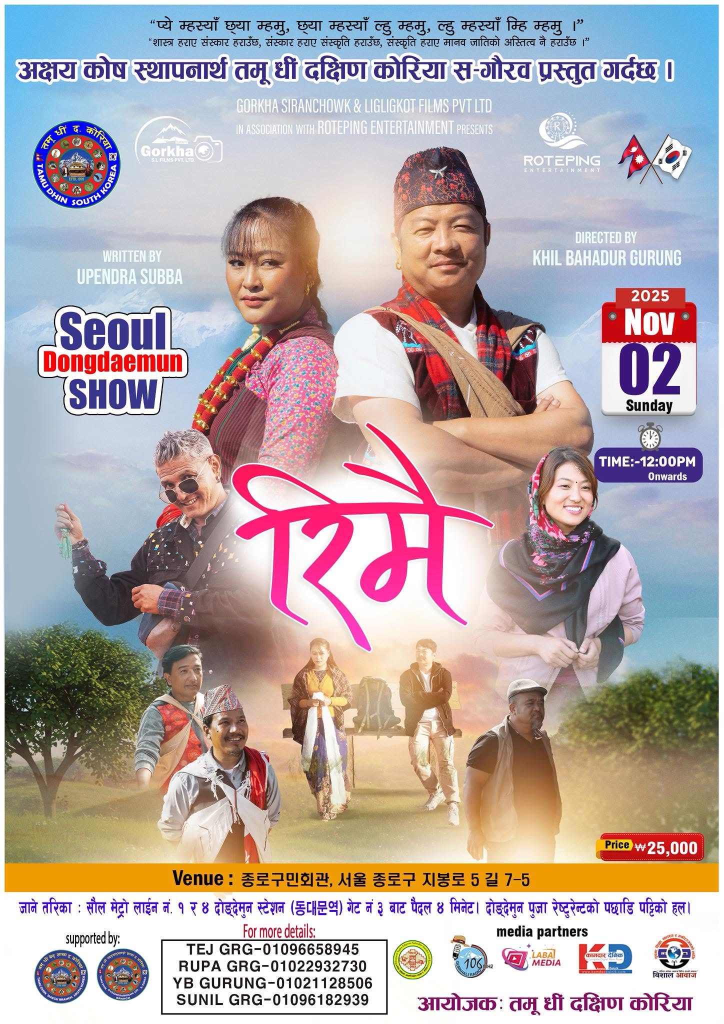 तमू धीं दक्षिण कोरियाले चलचित्र ‘रिमै’ प्रदर्शन गर्ने भएको छ। चलचित्र नोभेम्बर २ तारिखका दिन दिउसो १२ बजेदेखि दोङ्देमुन स्थित 종로구민회관 को हलमा प्रदर्शन हुनेछ। दोङ्देमुन स्टेसन ३ नम्बर गेटबाट हिँडेरै हलसम्म पुग्न सकिने छ।