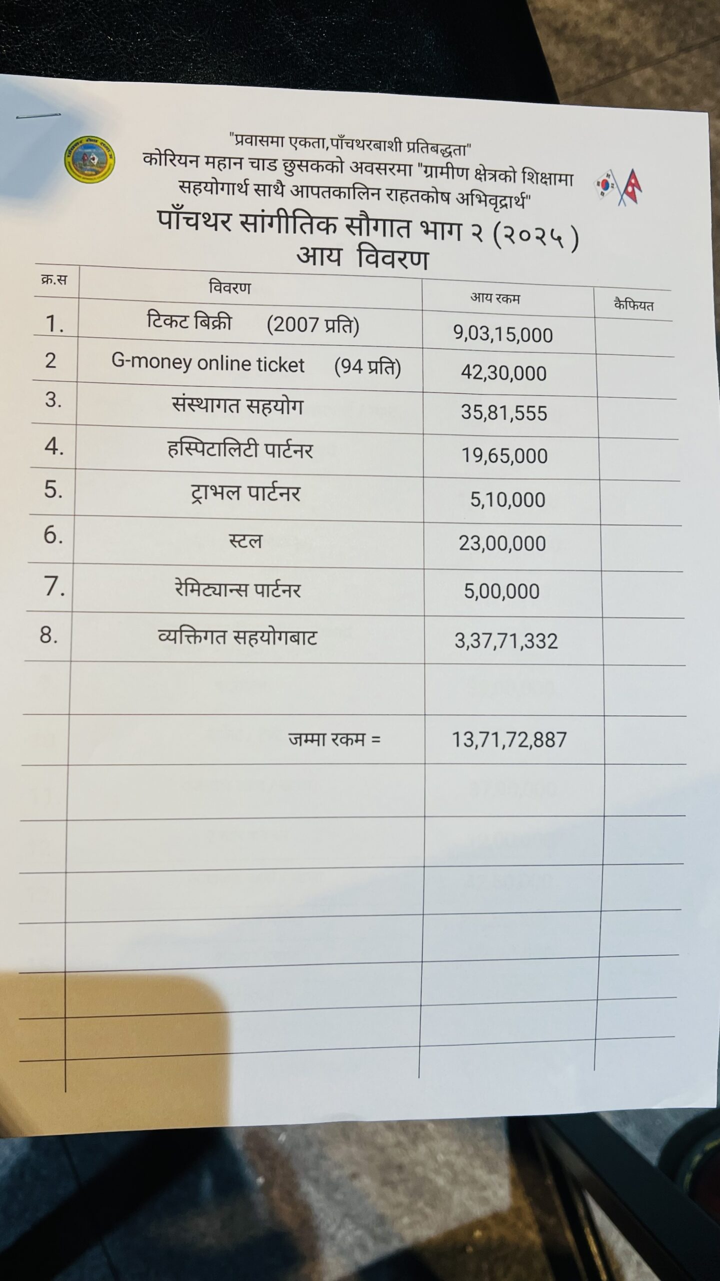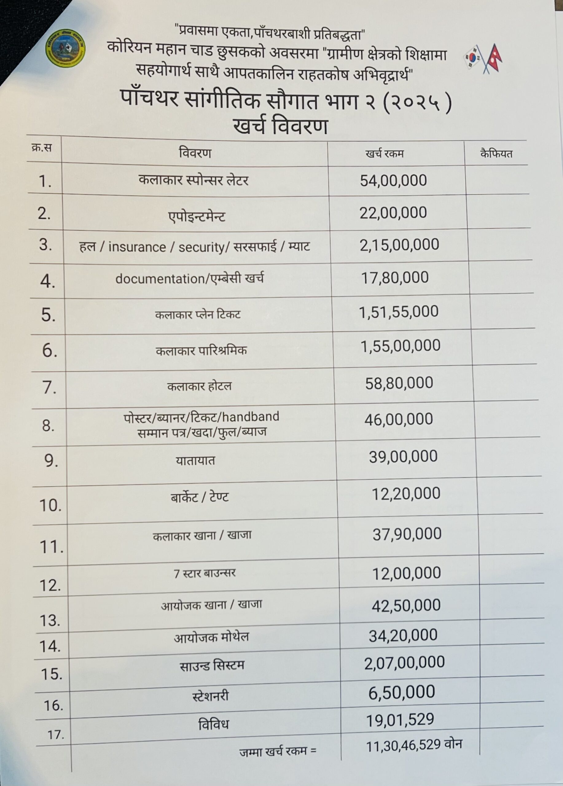 पाँचथर सांगितिक सौगात भाग २ को आयव्यय सार्वजनिक , २ करोड ४१ लाख वन बचत