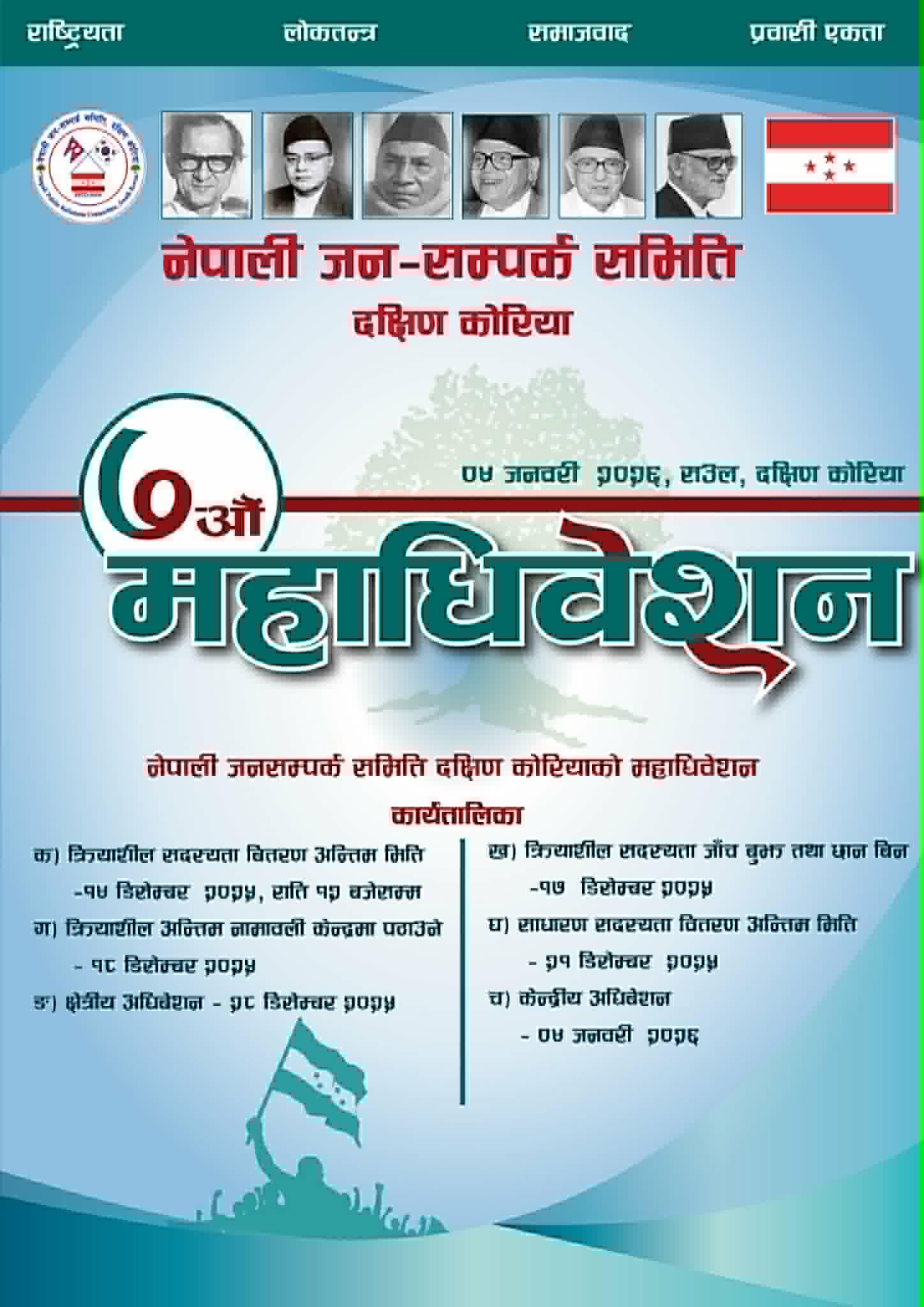 नेपाली जनसम्पर्क समिति दक्षिण कोरियाको महाधिवेशन हुने भएको छ। महाधिवेशन २०२६ जनवरी ४ आइतवार हुने अध्यक्ष भजिन्द्र क्षेत्रीले जानकारी गराएका छन्। साथै नेपाली कांग्रेसको प्रवास संगठन, नेपाली जनसम्पर्क समिति दक्षिण कोरियाले आफ्नो ऐतिहासिक ७ औं महाधिवेशन को विस्तृत कार्यतालिका र जिम्मेवारी सार्वजनिक गरेको छ।