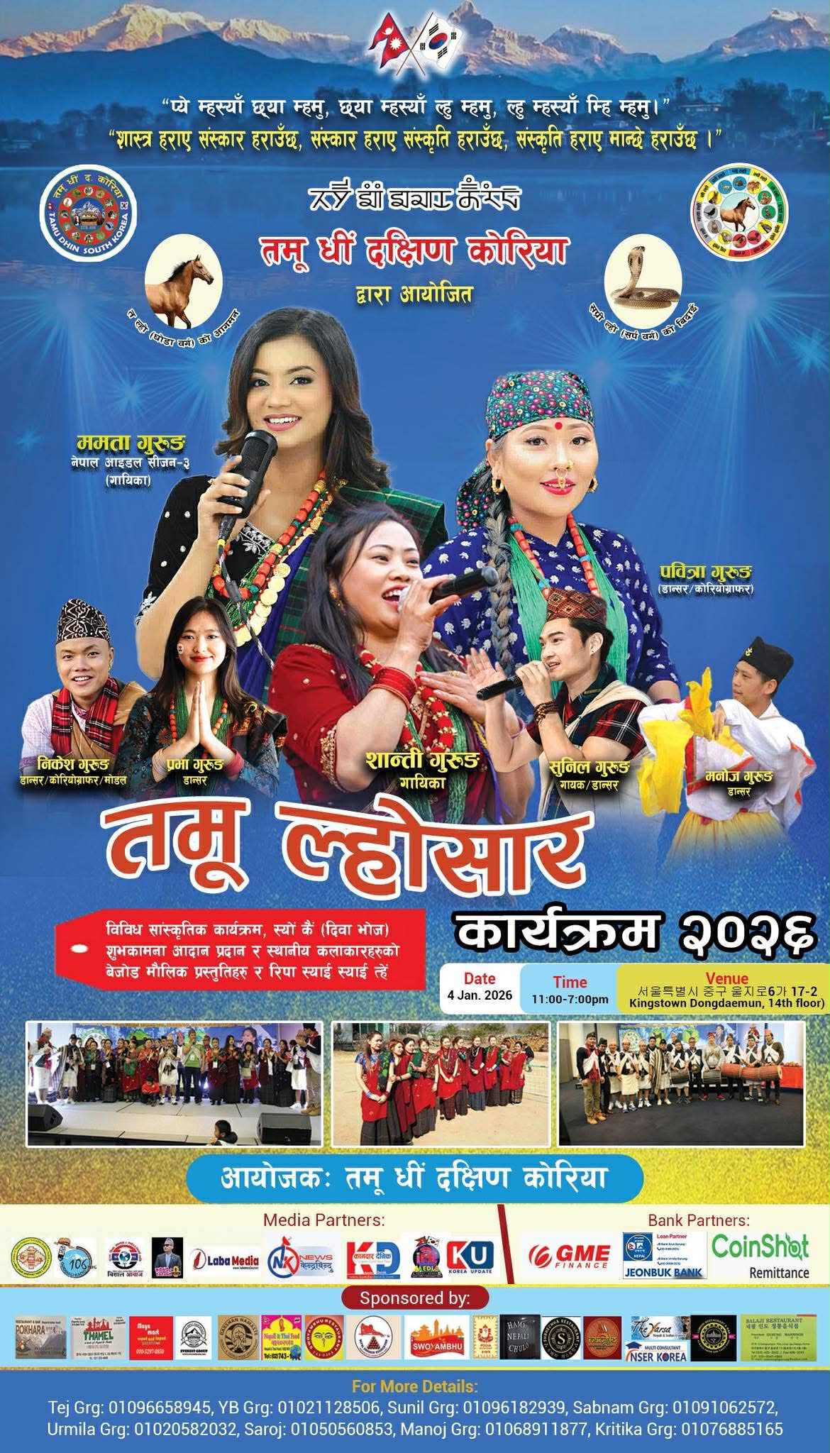 तमु धीं दक्षिण कोरियाले गुरुङ समुदायको नयाँ वर्ष “तमू ल्होसार” मनाउने भएको छ। जनवरी ४ का दिन चर्चित गायिका ममता गुरुङको साथमा मनाउने तैयारी पूरा भएको छ। उनीसँगै नेपालबाट डान्सर तथा कोरियोग्राफर पवित्रा गुरुङको समेत विशेष प्रस्तुति रहनेछ। दोङ्देमुन स्थित किङ्स टाउनको १४ औँ तल्लामा रहेको हलमा कार्यक्रम हुने आयोजकले जनाएको छ।