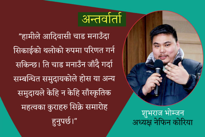 – निर्वचित भइसकेपछि कार्यसमिति र सल्लाहकार समितिमा छलफल पश्चात आवश्यकतालाई मध्यनजर गरि यो कार्यक्रम आयोजना गर्न लागिएको हो। दक्षिण कोरियाको सवालमा चाहिँ आदिवासी चाडबाडलाई वास्ता गरिन्न तर ठूला चाडवाड दशैँ तिहार आदि मनाउन तछाँडमछाँड गरिन्छ भन्ने कुरो उठिरहने, अनि हामीले के महसुस गर्यौँ भने अब हामीले नै सुरु गरौँ न, हामीले सुरु गरे अरुले पनि गर्लान भन्ने हो।